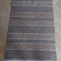 Grön trasmatta med inslag av ljusare gröna nyanser. Mattan har vita fransar i båda ändar.