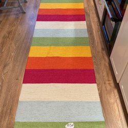 Pappelina matta i svart och vitt mönster. Mattan är vävd i plast.