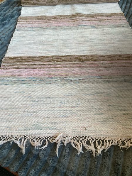 Trasmatta i bomull med ränder i olika färger. Mattan har fransar i ändarna.80x270cm