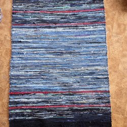 Trivsam randig trasmatta i ljusblått och krämvitt från Søstrene Grenes. 100 procent bomull. Mäter cirka 60x92 cm.
