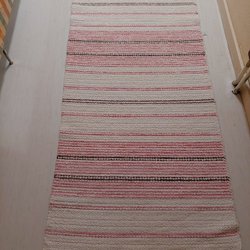Röd och vit vändbar matta. Tillverkad i Sverige. Mått: 70×250 cm. Lätt att göra ren så passande i kök eller liknande. Fint skick. Från djur-och rökfritt hem.