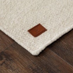 En fin matta med ett geometriskt mönster i svart och grått på en ljus bakgrund. Mattan har fransar på kortsidorna.
