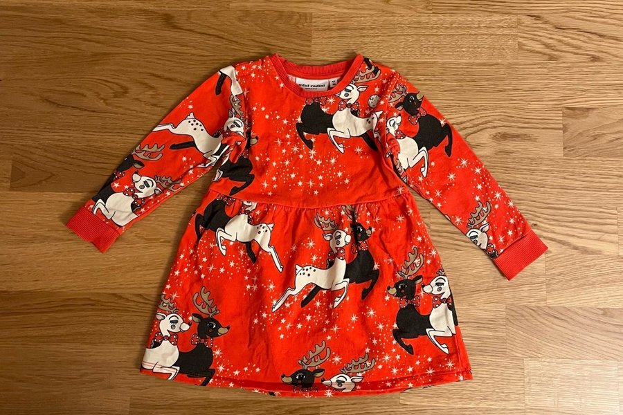 Mini Rodini finaste klänning med rådjur. Storlek 92/98, kan användas från storlek 80/86. Lite ytludd som det blir på dessa direkt efter tvätt men annars hel, ren och fin! Mycket fint helhetsintryck och fin i färgerna. Tack för ditt köp!
