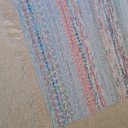 En handvävd trasmatta med ett unikt randigt mönster i olika färger. Mattan har fransar och passar bra i de flesta rum.