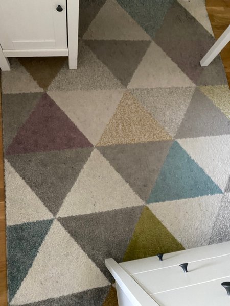 En matta med ett iögonfallande geometriskt mönster i olika färger. Perfekt för att ge rummet en modern touch.