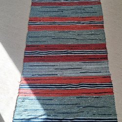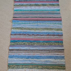 Trasmatta i bomull med fransar. Mattan har ett flerfärgat randigt mönster i nyanser av rosa, blått, grönt och vitt. Den är lämplig för användning i olika rum i hemmet.