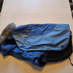 Hundtäcke i blå vaxad bomull med mörkblå pilefoder.