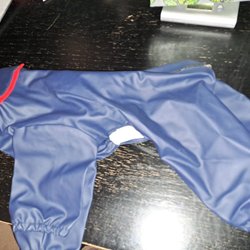 Vi köpte tyvärr fel storlek - för liten - så den är bara provad vid några tillfällen på vår tik (basenji 2 år). Innan vi förstod att den var för liten, klippte vi bort två resårband som skulle sättas fast runt hundens bakben, då de var i vägen. Så dessa saknas, därav priset.