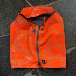 Värmande, lätt fodrat hundtäcke i mörkblå färg med brun manchester krage. Reglerbar rem med spänne för att anpassa omkretsen på undersidan (magen) samt reglerbara benband. Passar mindre modell av hund. Stl M. Längd 55 cm. Mycket fint skick som nytt. Nytvättat och doftar gott