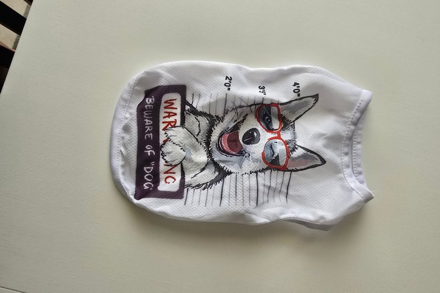 Vit tröja med tryck av en hund med glasögon och en skylt med texten "Beware of Dog". Hundens huvud är placerat framför en bakgrund som liknar en polisfotografering med höjdmått.