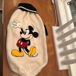 En barn tröja som är omsydd för hund. Gjort ett hål i ryggen för kopplet/sele och sen sytt med symaskin sicksack lite lätt runt hålet.