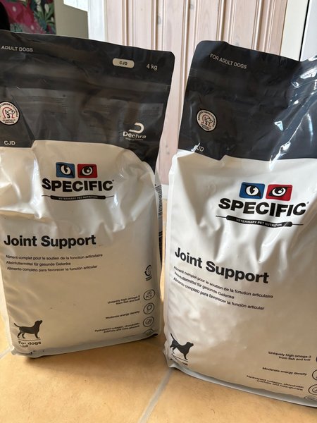 Två stycken 4 kg påsar med Specific Joint Support. Utgångsdatum 2027-04-15.
