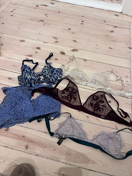 Använda och slitna BH:ar i storlek xs. Ett set med sex olika behåar. En blåmönstrad behå med bygel, en ljusblå spetsbehå, en vinröd behå med broderade blommor, en vit spetsbehå, en ljuslila spetsbehå och en vit.