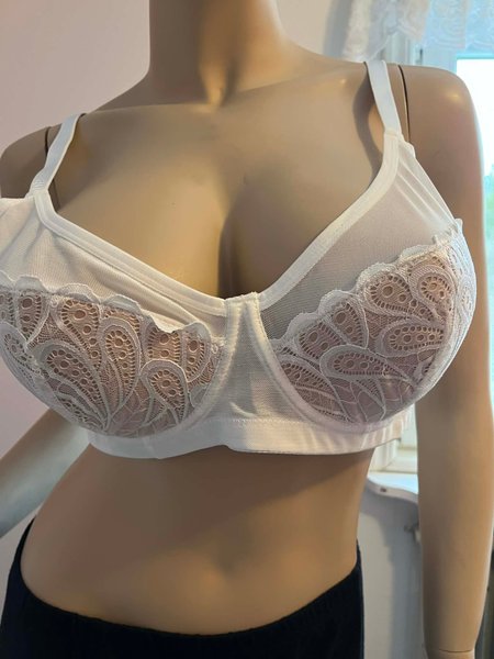 Vit behå med bygel och ovadderade kupor. Behån har breda axelband och spetsdetaljer på kuporna. Kuporna är i mesh med ett blommigt spetsmönster.