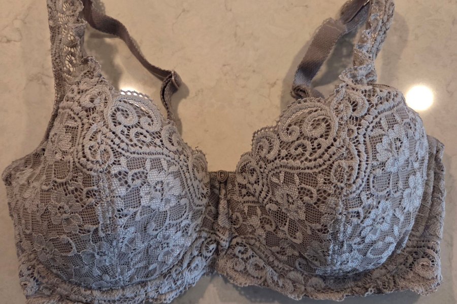 Grå spets-bh med bygel och justerbara axelband från Triumph. Kuporna är täckta med ett detaljerat spetsmönster.