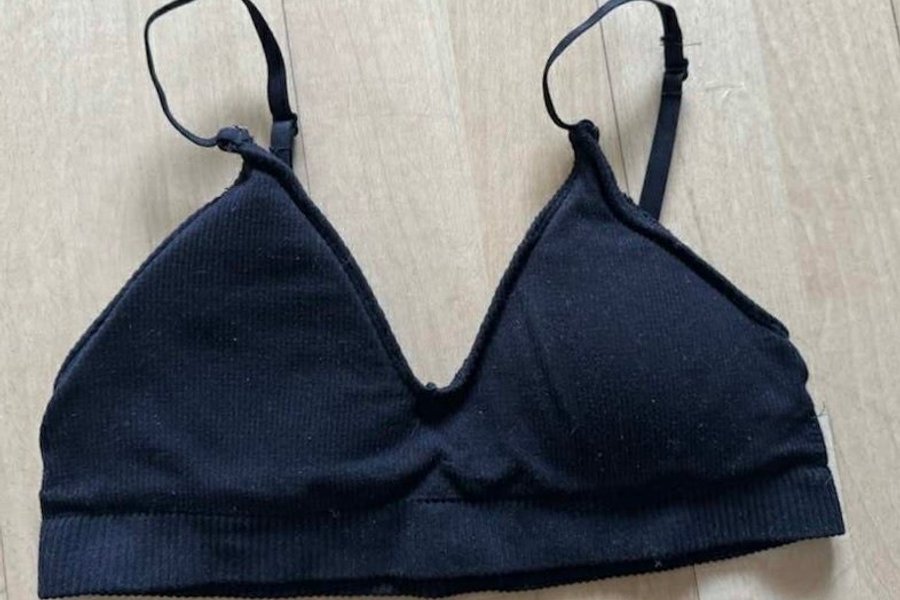 Sort trekants-bh med justerbare stropper. Den har en ribbet tekstur og en elastisk kant under barmen for ekstra støtte.