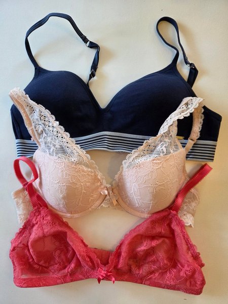 Denna annons inkluderar tre behåar. En mörkblå t-shirt behå med ränder, en ljusrosa spetsbehå med bygel med en liten rosett framtill och en korallfärgad spetsbehå utan bygel med en liten rosett framtill.