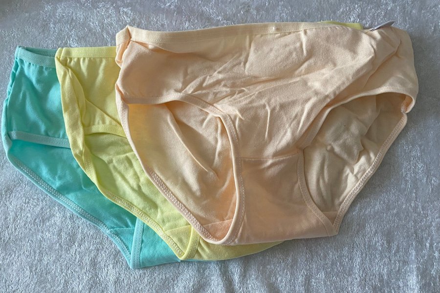 Här är ett set med tre trosor i olika pastellfärger. Färgerna inkluderar ljus turkos, ljusgul och persika. Trosorna är av en klassisk modell.