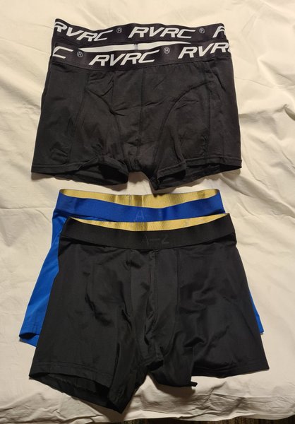 4 st kalsonger. Ett par är svarta med en vit logotyp på linningen. Det andra paret består av en svart kalsong med en blå och gul linning. Revoulutionrace och zlatan