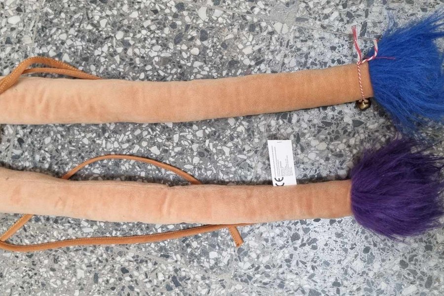 Två trollsvansar med plysch och snöre. En har blått hår och en liten bjällra, det andra har lila hår.