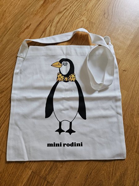 Vit tygväska från Mini Rodini med ett tryck av en pingvin med fluga. Väskan har två handtag.
