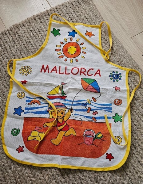 Söt förkläde med motiv från Mallorca. Förklädet är vitt med gula detaljer och har ett tryck med en sol, en flicka på stranden, en båt och en drake. Det står "Mallorca" på förklädet. Ny oanvänd, till mindre barn