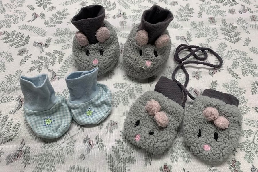 Ett set med två par tossor och ett par vantar. Ett par tossor är ljusblå med ett rutigt mönster och en broderad stjärna. Det andra paret tossor och vantarna är grå med en liten rosett.
