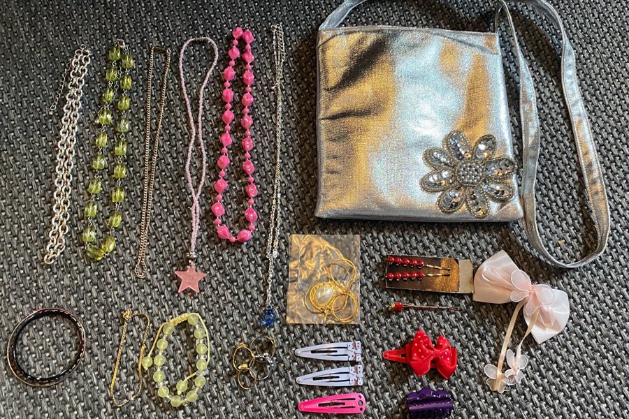 En silverväska tillsammans med halsband, armband, hårspännen och ringar för barnen.