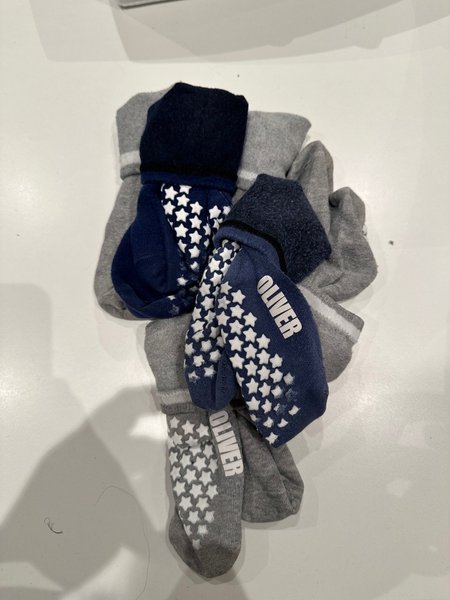 Här är sex par gråa och blåa strumpor med texten ”OLIVER”. Storlek 28-31