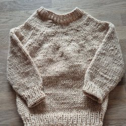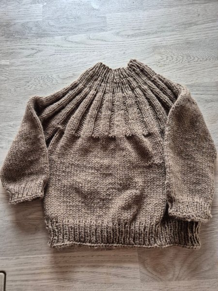 Strikket sweater med en ribbet halsudskæring og et mønster, der fortsætter ned over skuldrene. Ærmerne og kroppen er strikket i et glat mønster, mens manchetterne og nederste kant har en ribbet finish. Sweateren har lange ærmer og en rund hals. Hjemme strikket af alpacca og cashmir garn str. 1 - 2 år pris 150 kr