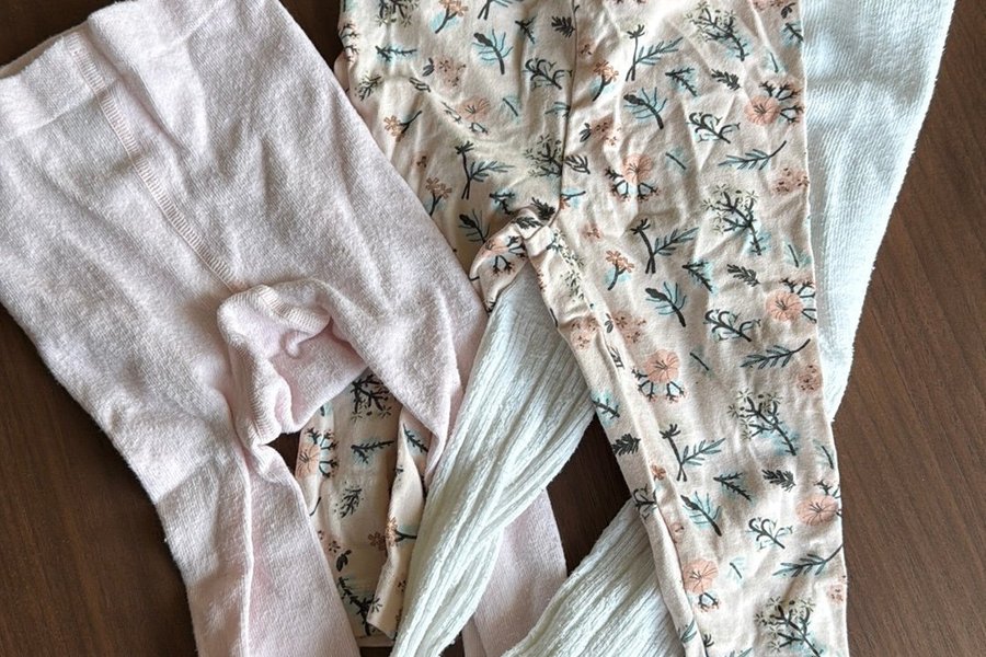 Ett paket med tre par strumpbyxor för barn. Ett par är enfärgat ljusrosa, ett par är mönstrat i ljusrosa med blommor och blad, och ett par är enfärgat vitt med ribbad struktur.