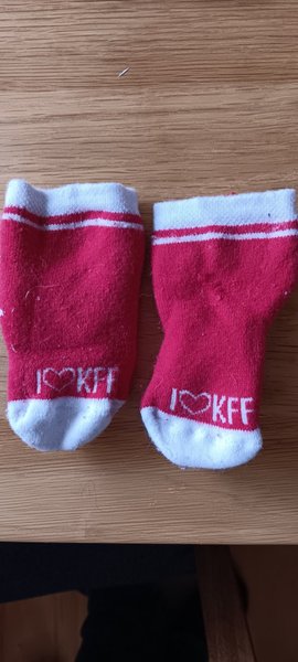 Ett par röda bebisstrumpor med vita detaljer. Text "I ??KFF".