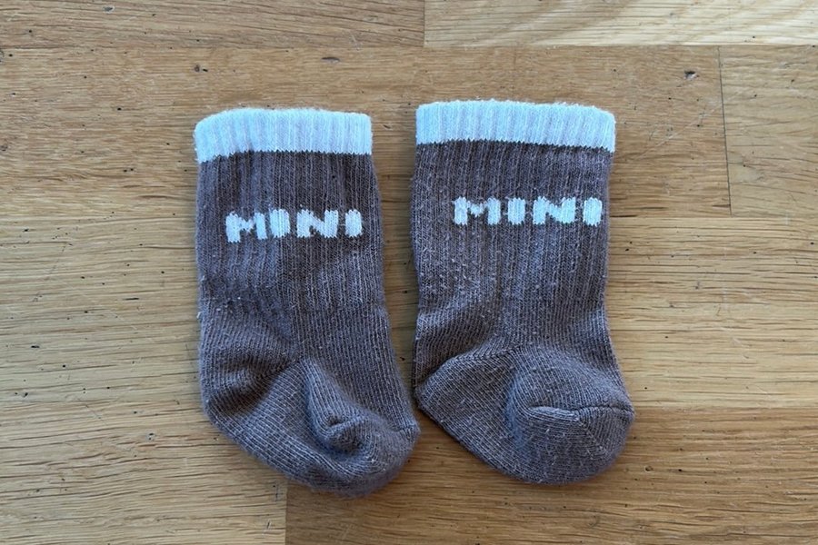 Ett par bruna strumpor med vita detaljer. Strumporna har texten "MINI" i vitt på skaftet och en vit mudd upptill.