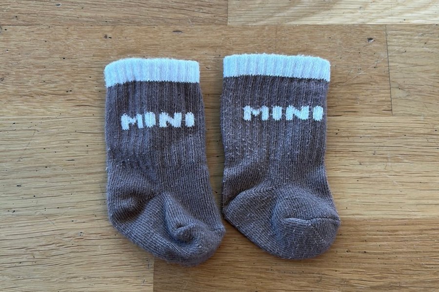 Ett par bruna strumpor med vita detaljer. Strumporna har texten ”MINI” i vitt på skaftet och en vit mudd upptill.