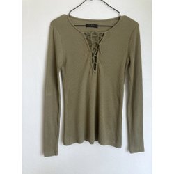 Brun stickad topp i ullblandning, upprullade ärmar med justerbara hällor, längre bak, lätt lyster, något nedhasad axel. Visst ytslitage finns.