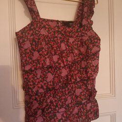 Snygg, tunn, transparent blus med mönster i lila, rosa och vitt. Blusen har en krage och knappar framtill. Den är utan ärmar och har en rak passform.När jag postat varan ansvarar jag inte längre för den. Jag postar inom 7 dagar. Jag postar oftast på helgen. Jag samfraktar givetvis, så kolla mina andra auktioner!