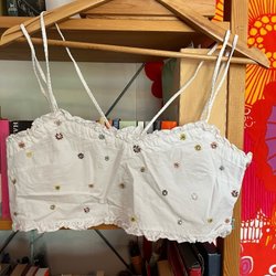 Hvid top med v-udskæring og flæseærmer. Toppen har et broderet mønster og en justerbar snøre i taljen.