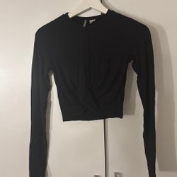 Svart, ribbad crop top med långa ärmar och hög hals.