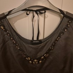 Super fin grå topp med lite skimmer i sig och lät genomskinlig material som är oregelbundet skrynklig. Köpt så Filippa K sample sales då har den inga etiketter eller tvätt lappar. Jag föreslår att den är i polyester med lite elastan, då den är strechi och säkert kan tvättas på 30 eller 40 grader. Jag har aldrig tvättat den. Jätte kul top verkligen. Jag passar inte så bra i rundringade tyvärr. Det var impuls köp. Jag är 164 cm lång och den går ungefär till rumpan på mig på längden. Jag har aldrig haft den på mig, bara provat. Skulle passa super fint med jeans, under kavaj eller cardigan.