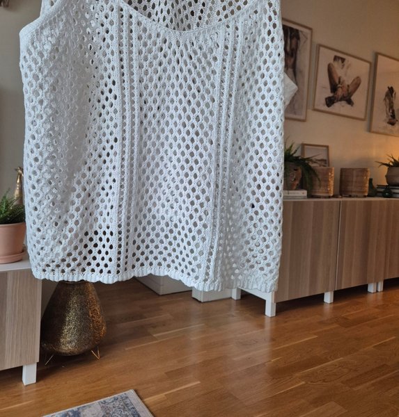 Vit stickad topp med ett fint, genombruten mönster. Toppen har ett avslappnat, löst fall och är perfekt för varma sommardagar eller lager-på-lager styling. Den har tunna axelband och en rak, avslappnad passform. XL mått över byst 64cm o från axel o ner 55cm