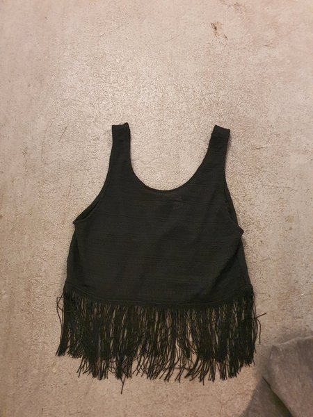 Svart crop top med fransar nedtill. Den har breda axelband och rund halsringning.
