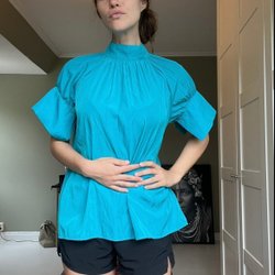 Vit, långärmad spetstopp med v-ringning och rynkdetaljer framtill. Toppen har en knappslå fram.