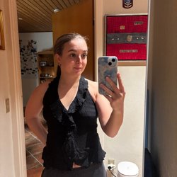 Elegant sort top med pailletter i et bølgemønster. Den har en rund halsudskæring og er uden ærmer. Perfekt til en aften i byen eller en festlig lejlighed.