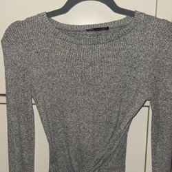 En svart långärmad topp med ribbad struktur. Toppen har en knytdetalj i midjan som kan knytas fram eller bak.