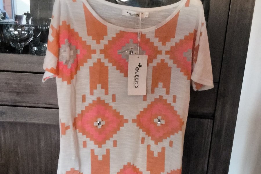 Vit topp med kort ärm och ett mönster i orange, rosa och grått. Mönstret har även små stenar som detaljer.