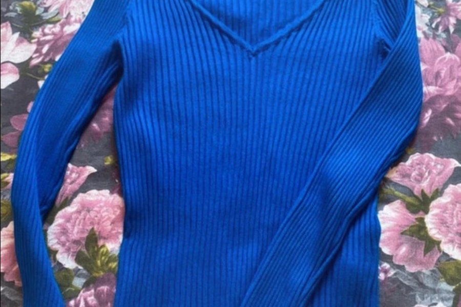 En långärmad tröja med V-ringning och ribbad struktur. Tröjan är enfärgad i en klar blå nyans. Köpt för 599kr, Använd fåtal gånger och fortfarande i mycket god skick.