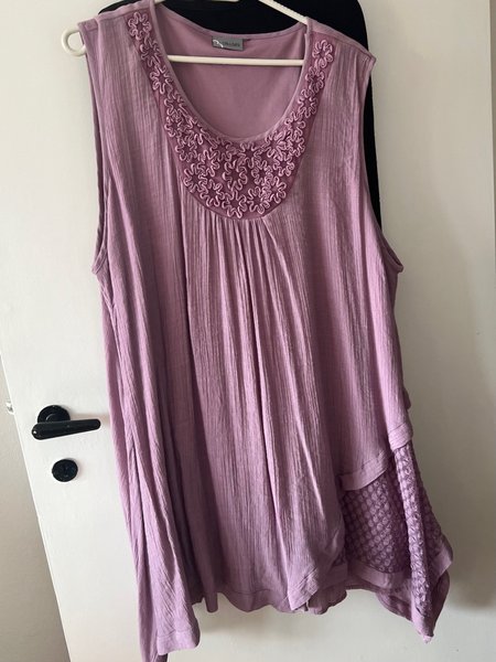 Denne ærmeløse top har en smuk lilla farve og et unikt design. Halsudskæringen er dekoreret med et detaljeret blomstermønster i samme farvetone, hvilket giver et elegant præg. Toppen har en løs pasform med en let krøllet tekstur i stoffet. I den nederste højre side er der et indsat panel med et mønstret, gennembrudt design, der tilføjer et legende og feminint element. Den asymmetriske kant fuldender looket.