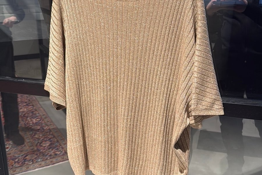 Ribbstickad topp med kort ärm och rund halsringning. Toppen har en lös passform.