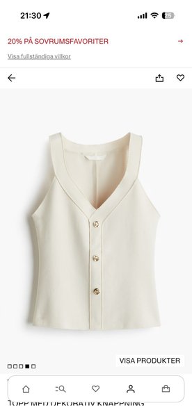 Topp med dekorativa knappar framtill. Toppen har en V-ringning och breda axelband med en diskret vågig kant. Använd 1 gång köpt för 190 kr