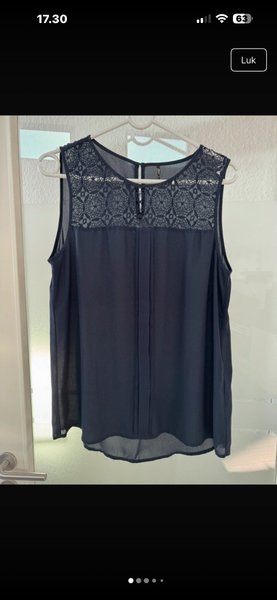 Mørkeblå ærmeløs top med et elegant blondestykke øverst. Toppen har en rund halsudskæring og en lille åbning med knaplukning i nakken. Den falder løst og har en let gennemsigtig kant forneden.